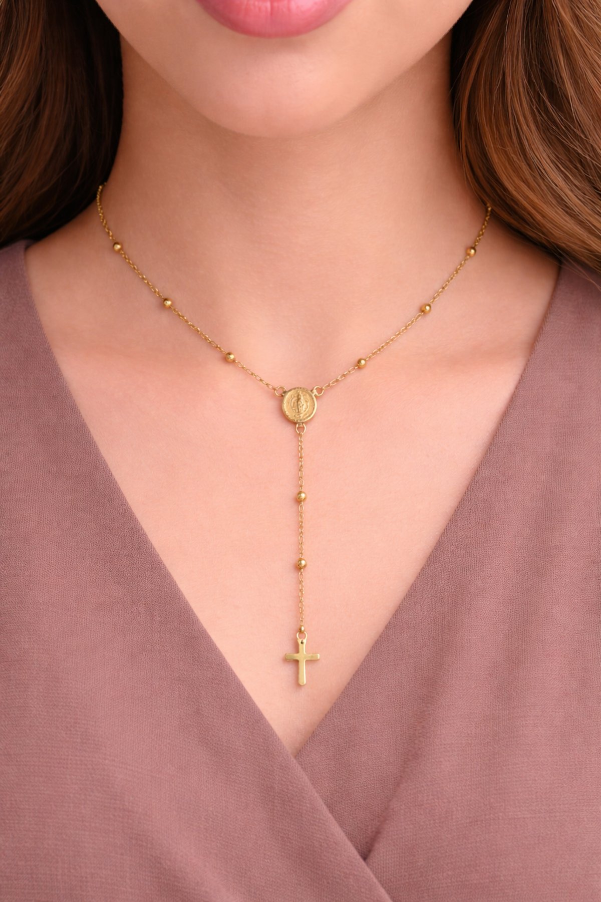 Collar delicado con diseño tipo rosario, que combina una medalla central y una cruz colgante. Un accesorio elegante y con significado, ideal para realzar cualquier look.